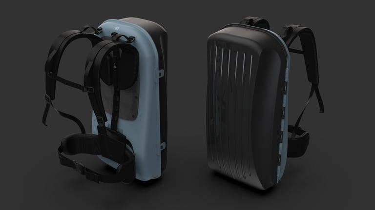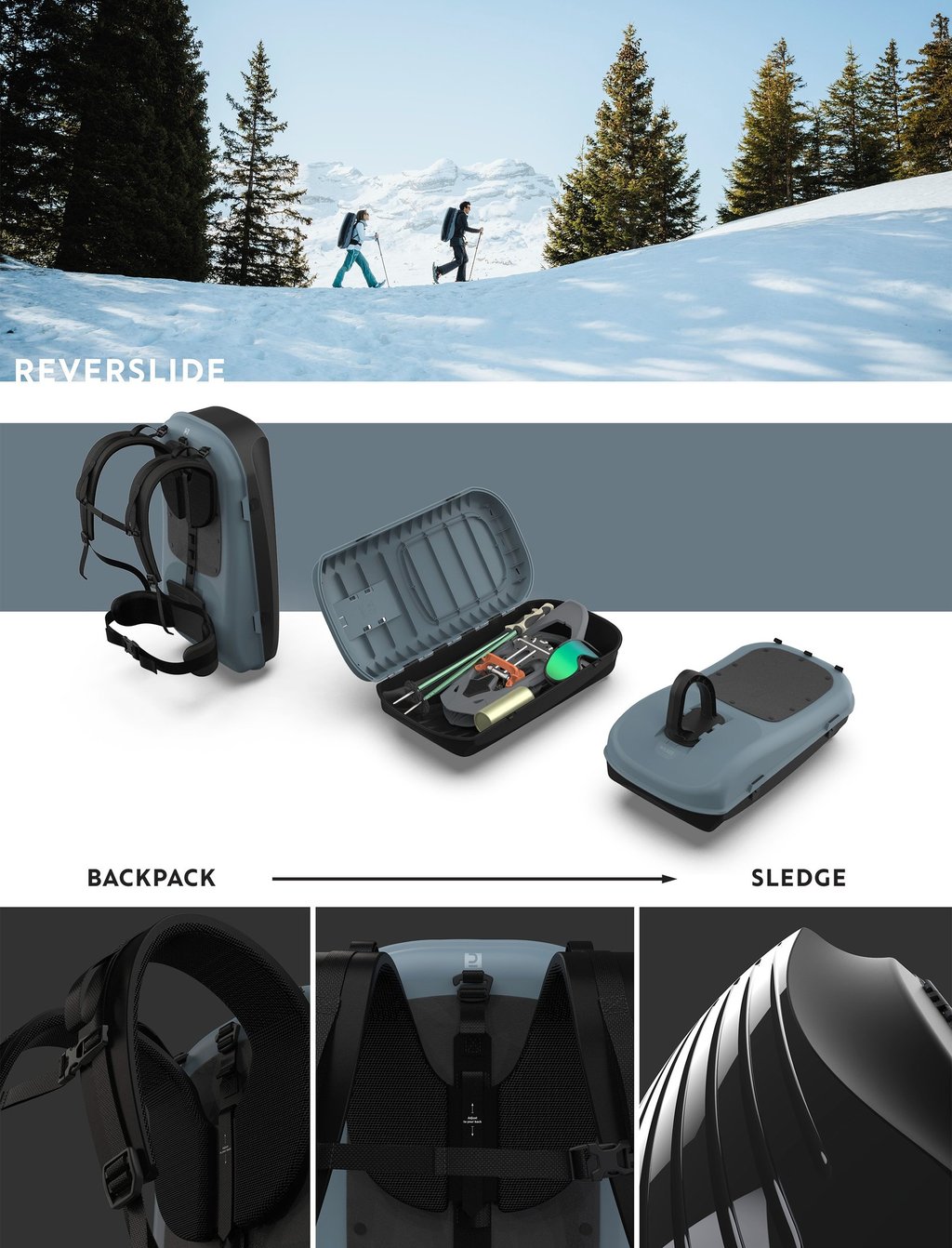 Cette luge atypique se compose d’une coque rigide qui, selon son équipement, peut être utilisée de deux manières : en sac à dos lorsqu’elle est munie de ses bretelles, et en luge sur laquelle on peut s’asseoir lorsqu’elle est dotée de sa poignée.