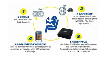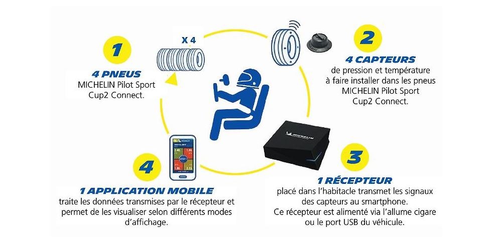 Des capteurs installés à l’intérieur des pneus, mesurent la pression et la température en continu. Ces informations sont alors envoyées vers le boîtier Track Connect qui permet de traduire les signaux des capteurs en Bluetooth afin d'êtres affichés en direct sur un smartphone grâce à une application dédiée.